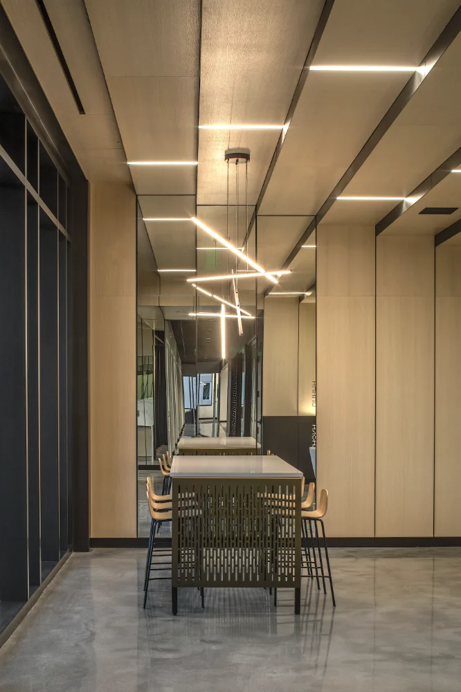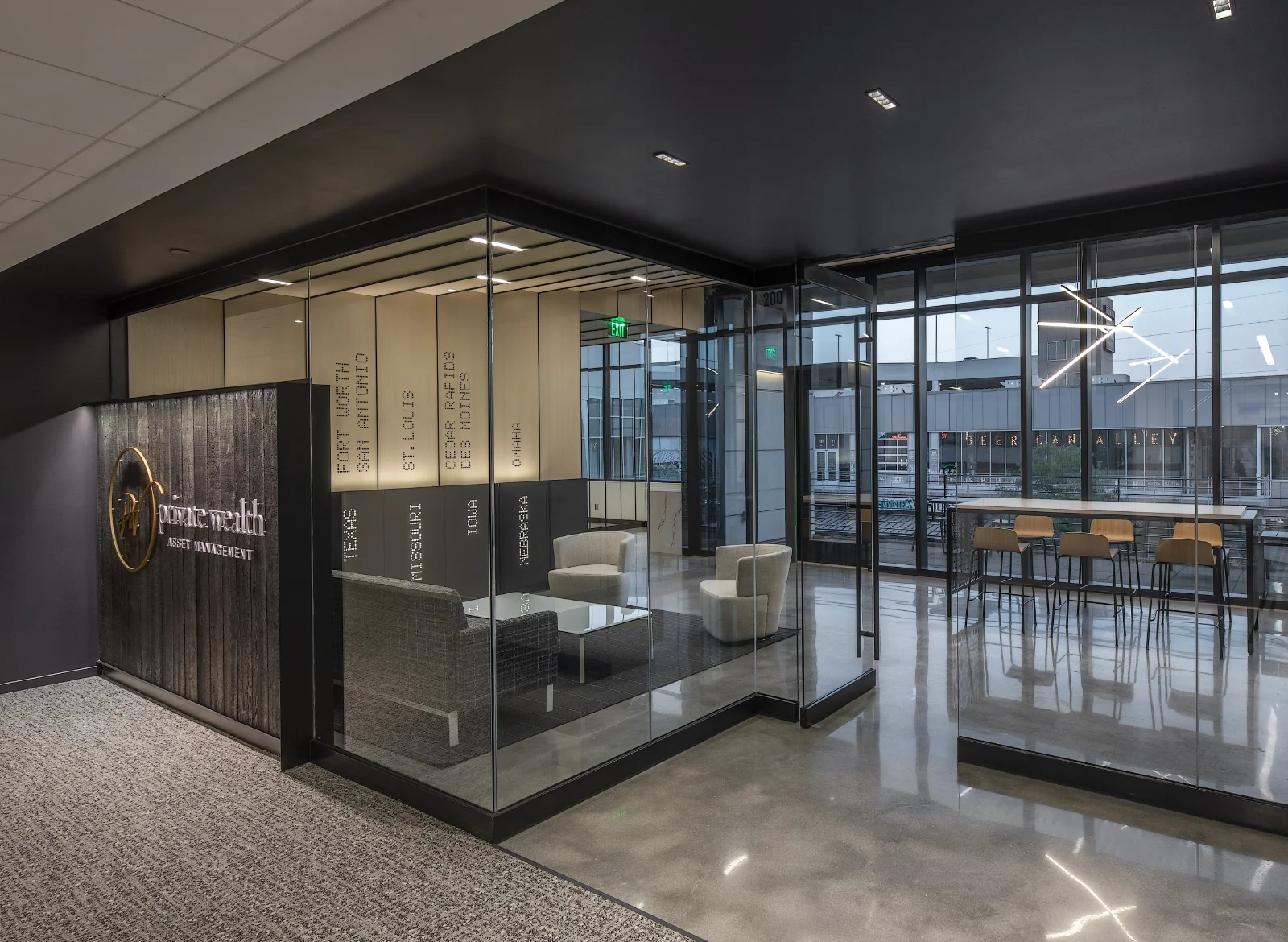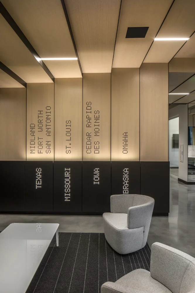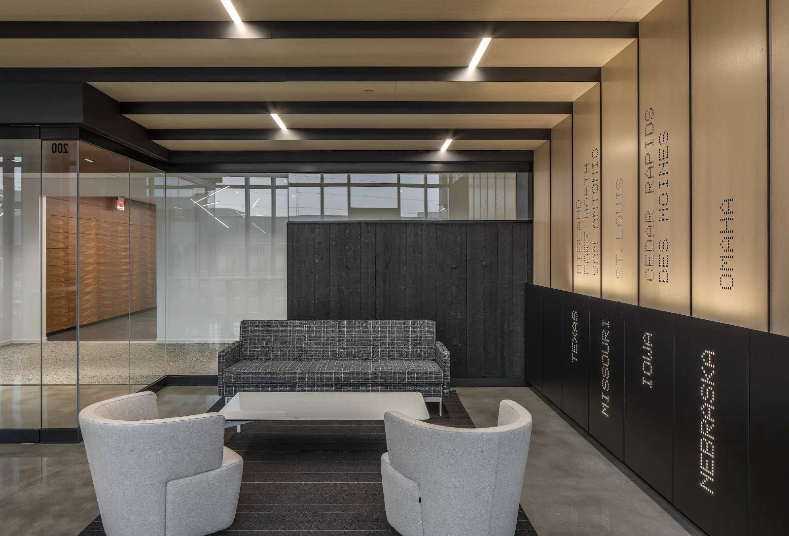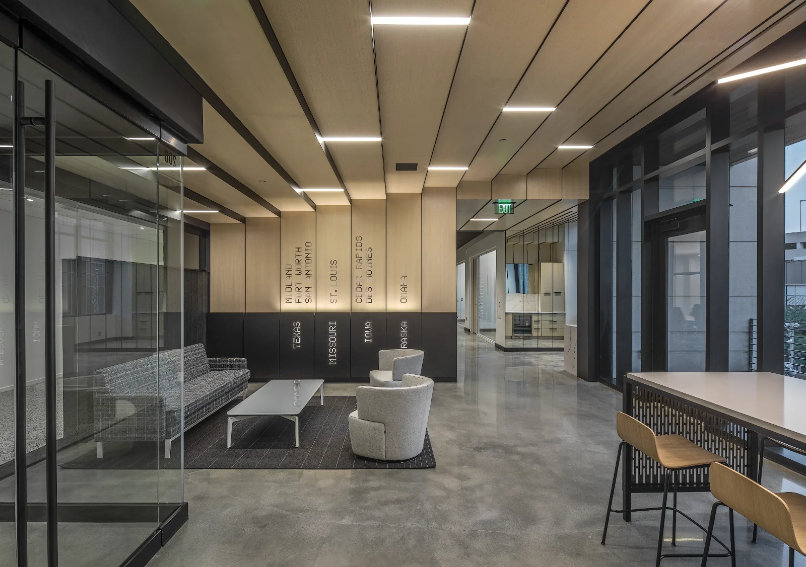 As the first tenant on a multi-tenant floor in the commercial office building, the office entrance is strategically positioned next to the elevator lobby, making a strong first impression. The finish palette was intentionally limited to emphasize the repetition of materials, including polished concrete, painted black steel, and stained red oak veneer, builds a sophisticated aesthetic. The resulting space strikes a delicate balance between fitting into the neighborhood and showcasing the company’s passion for financial strength. The ceiling’s methodical stair-step gesture is a nod towards compounding wealth. The neutral architectural canvas allowed subtle color insertions in furniture and accent paint within offices, such as blue, lime green, pink, and orange. Programming requests for entertainment areas and natural daylight in offices informed the layout of the tenant space. The overall design of the space embodies a sense of advancement and success, much like the focus of the company—compounding wealth through innovation and team-based expertise.