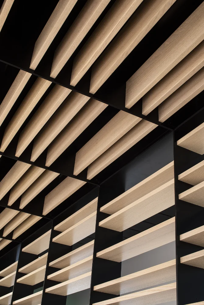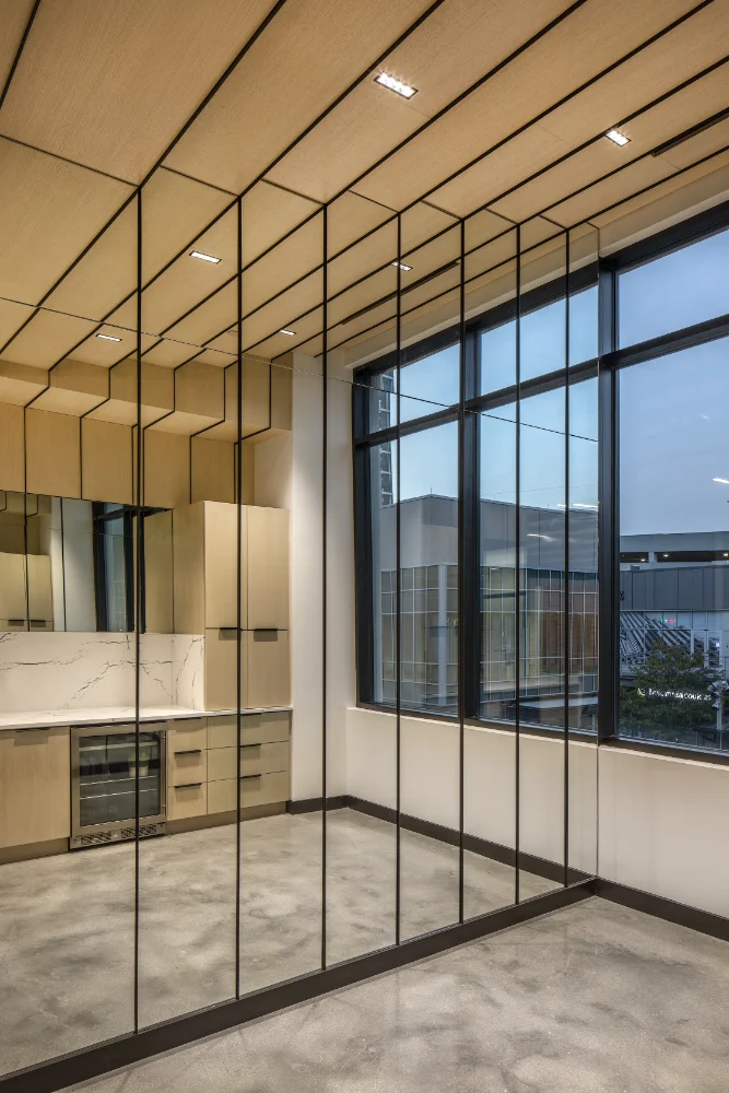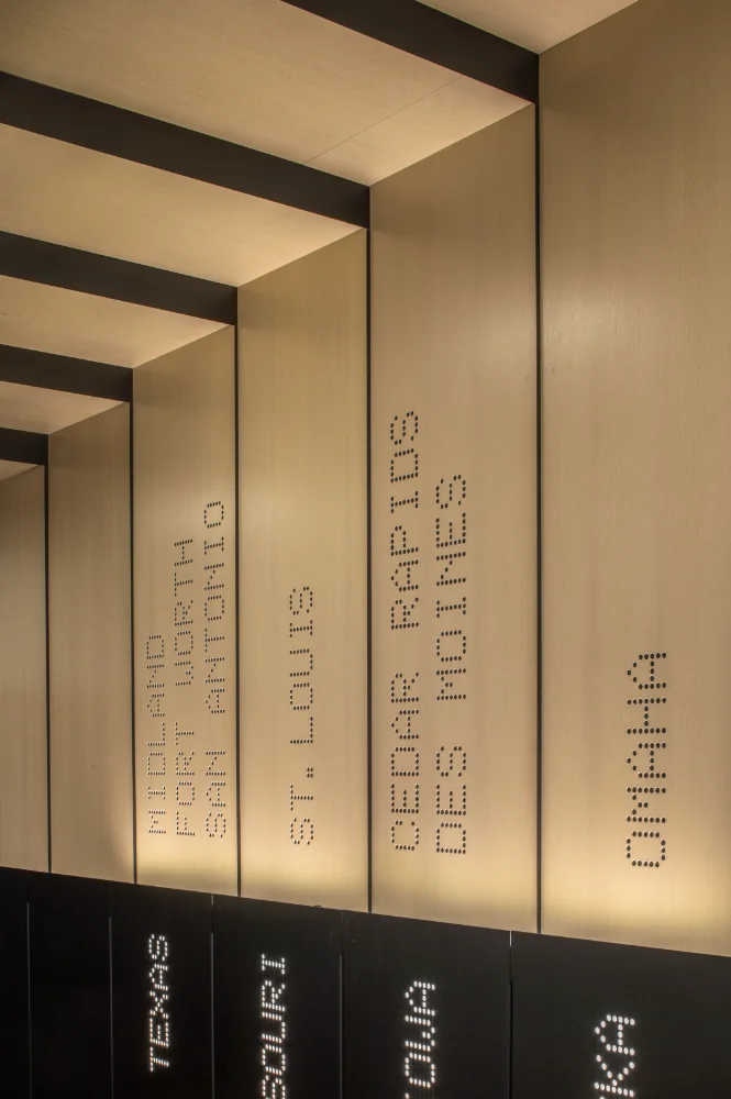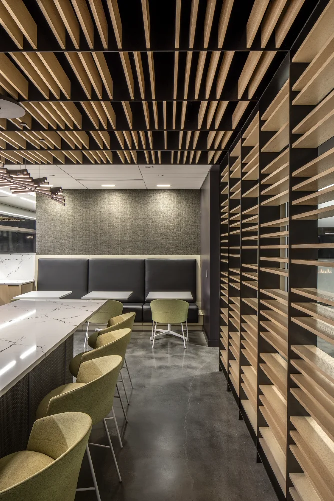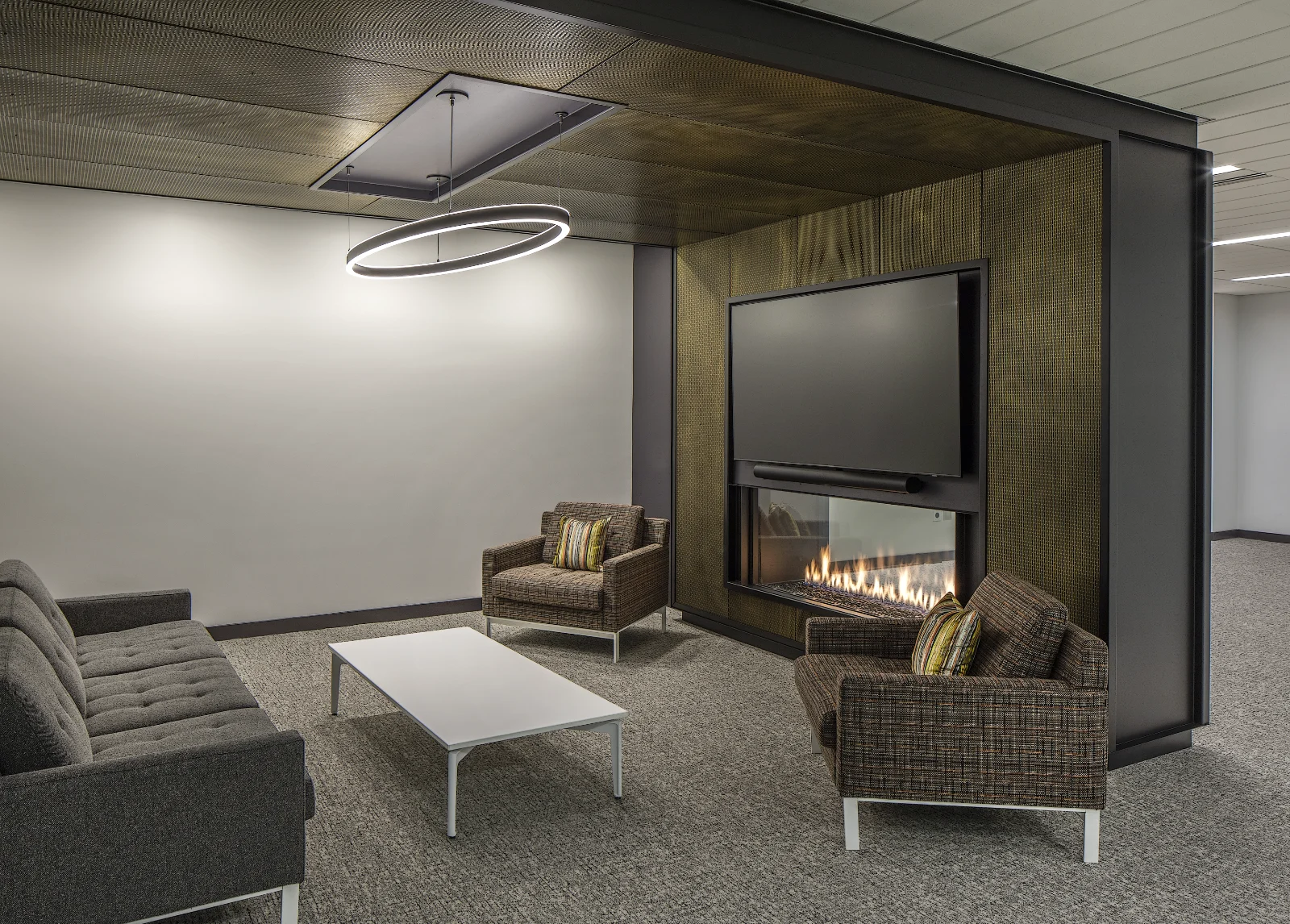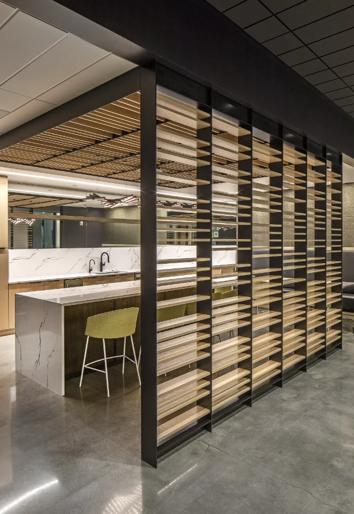 As the first tenant on a multi-tenant floor in the commercial office building, the office entrance is strategically positioned next to the elevator lobby, making a strong first impression. The finish palette was intentionally limited to emphasize the repetition of materials, including polished concrete, painted black steel, and stained red oak veneer, builds a sophisticated aesthetic. The resulting space strikes a delicate balance between fitting into the neighborhood and showcasing the company’s passion for financial strength. The ceiling’s methodical stair-step gesture is a nod towards compounding wealth. The neutral architectural canvas allowed subtle color insertions in furniture and accent paint within offices, such as blue, lime green, pink, and orange. Programming requests for entertainment areas and natural daylight in offices informed the layout of the tenant space. The overall design of the space embodies a sense of advancement and success, much like the focus of the company—compounding wealth through innovation and team-based expertise.